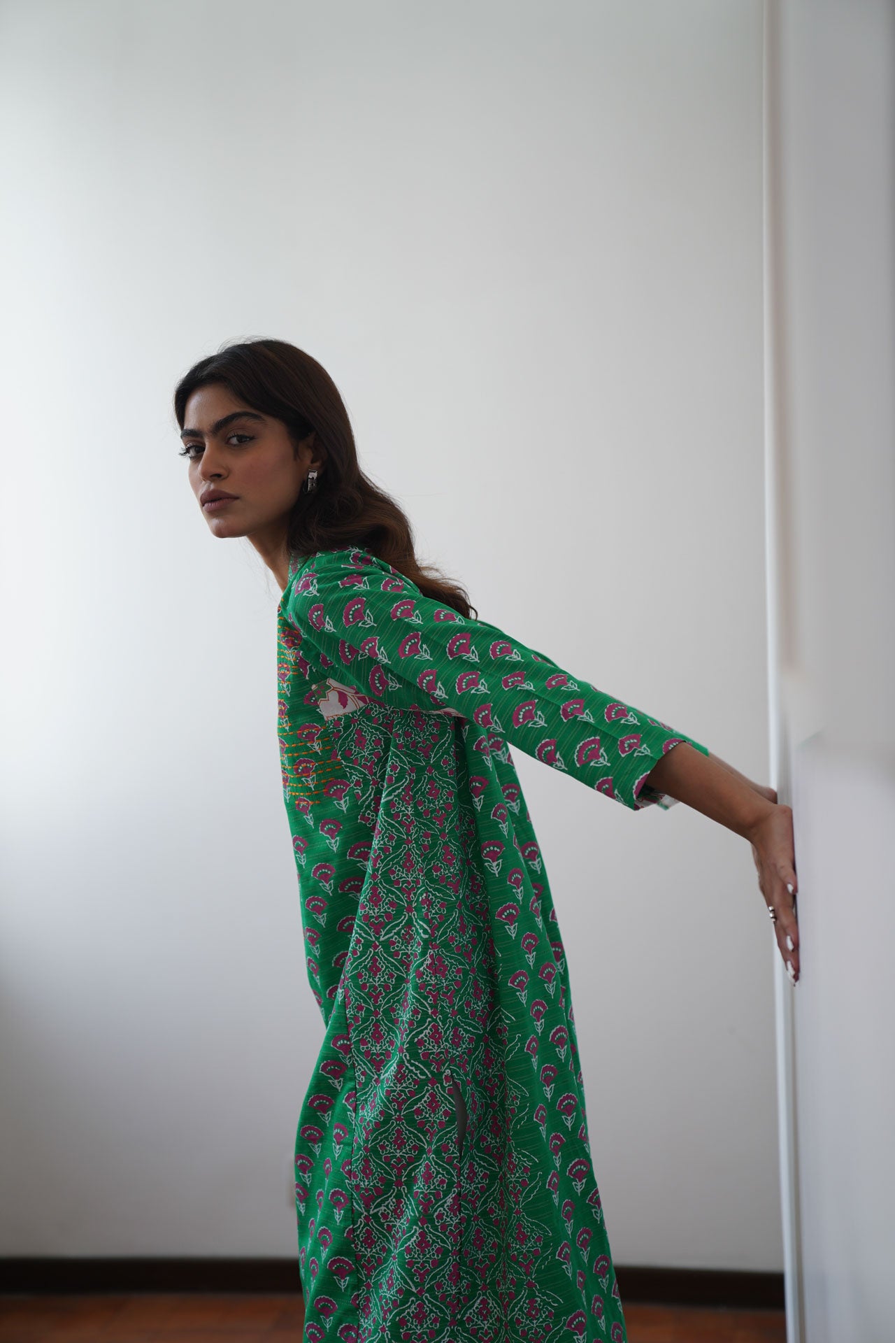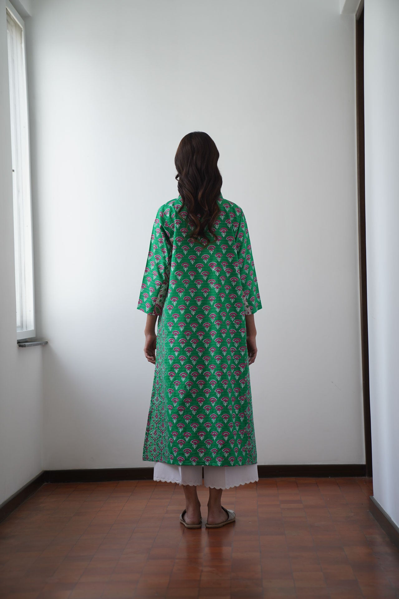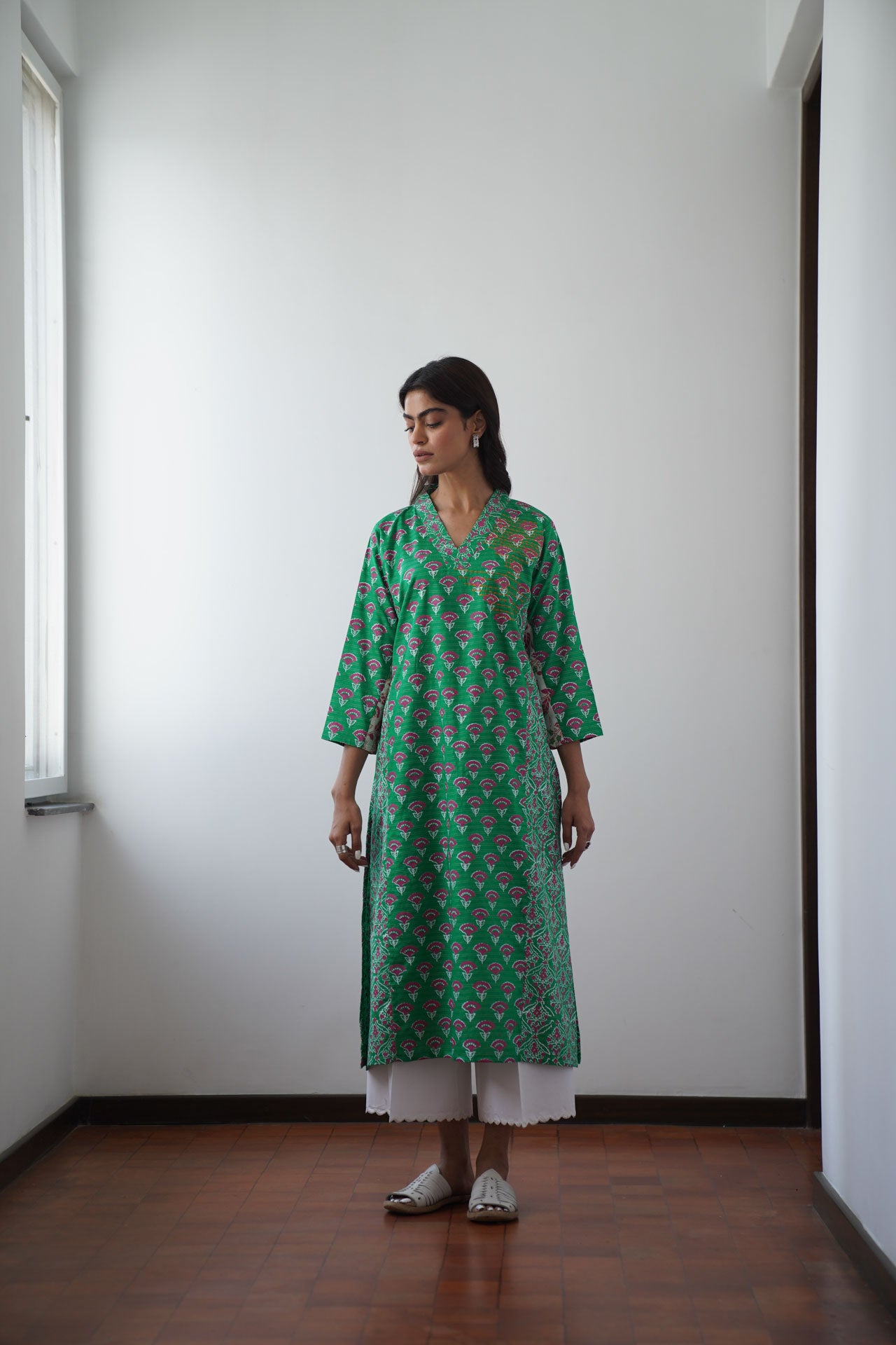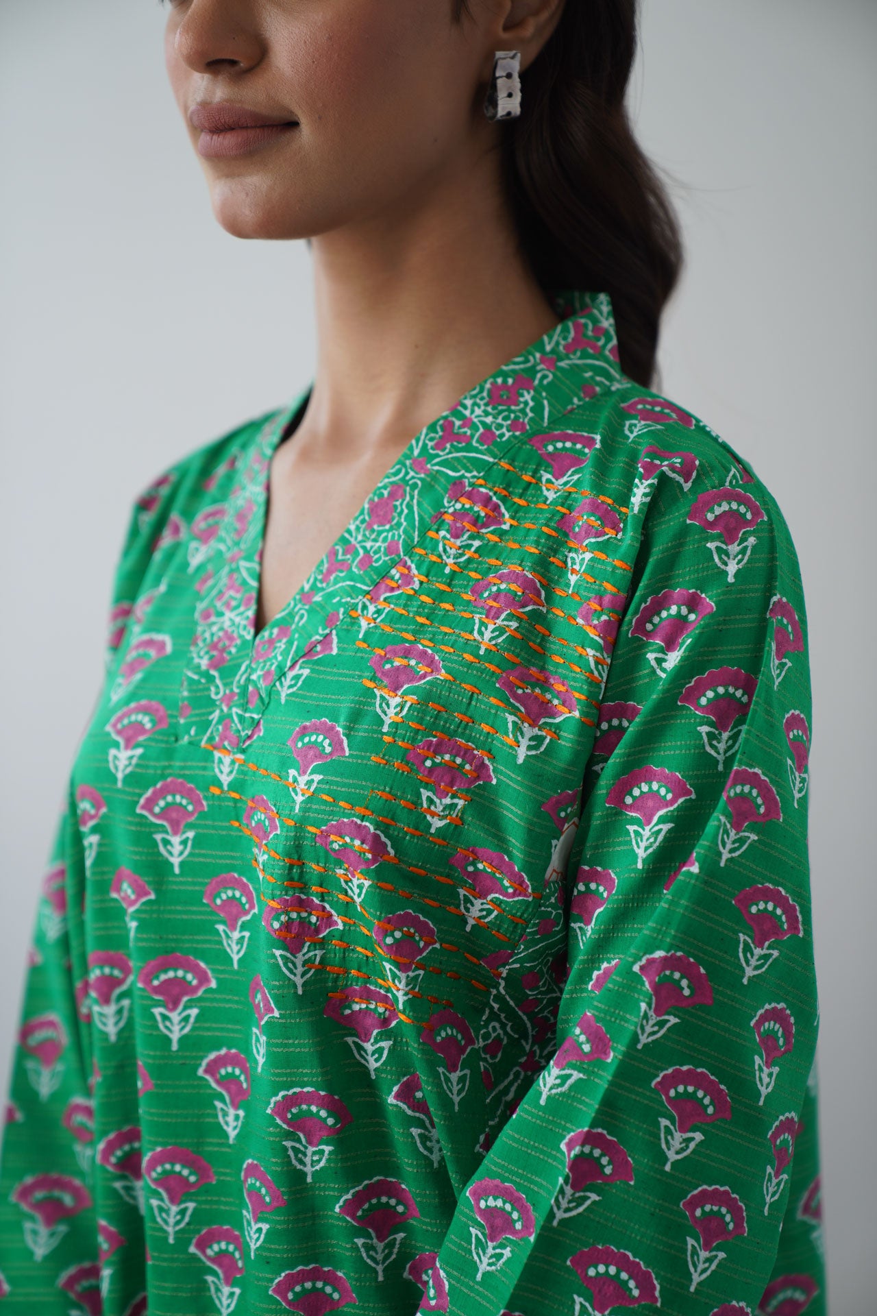 This all over hand block printed shirt features a V neck with contrast-color embroidered running stitch on front. detail for a unique, eye-catching look.