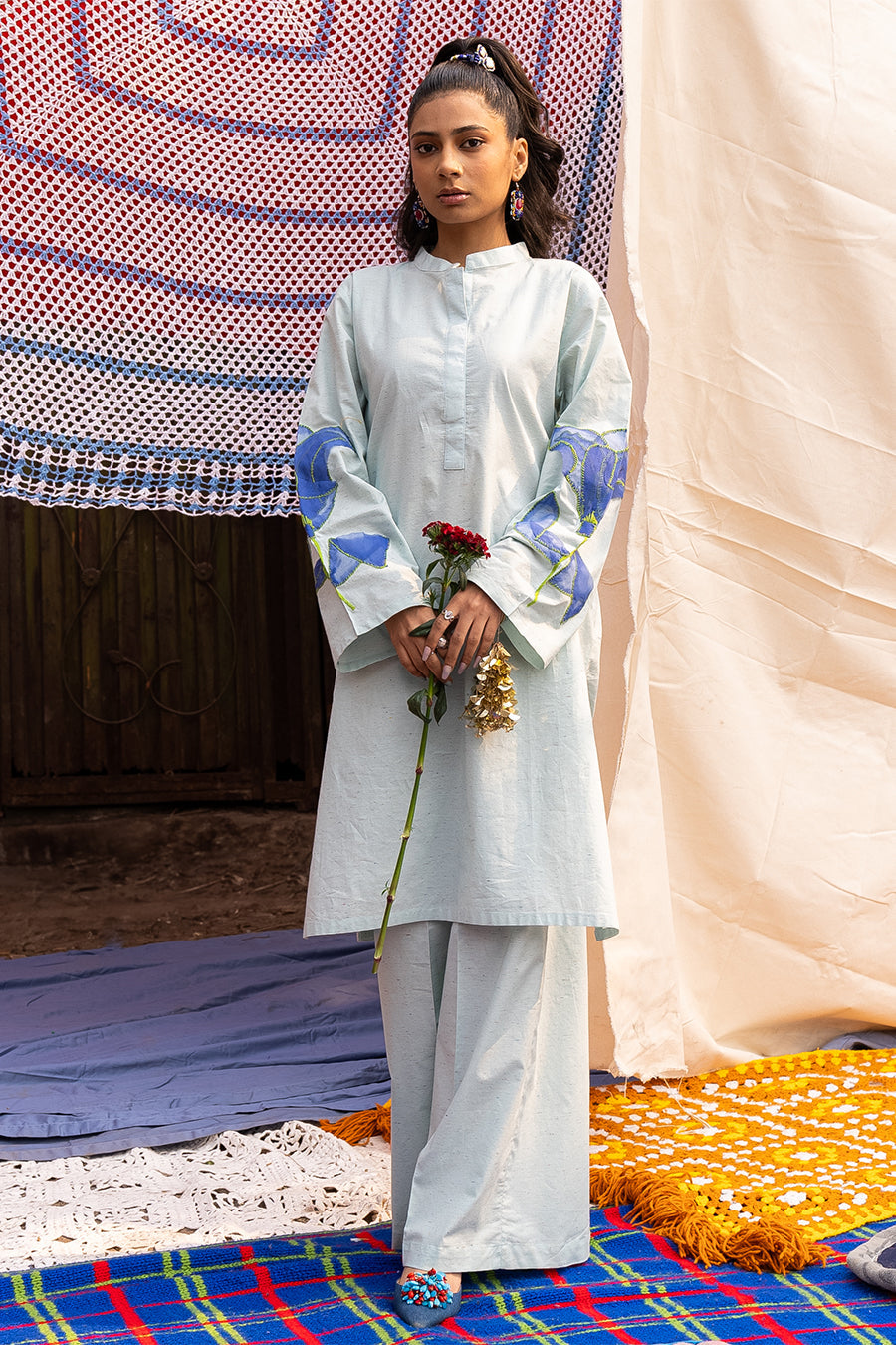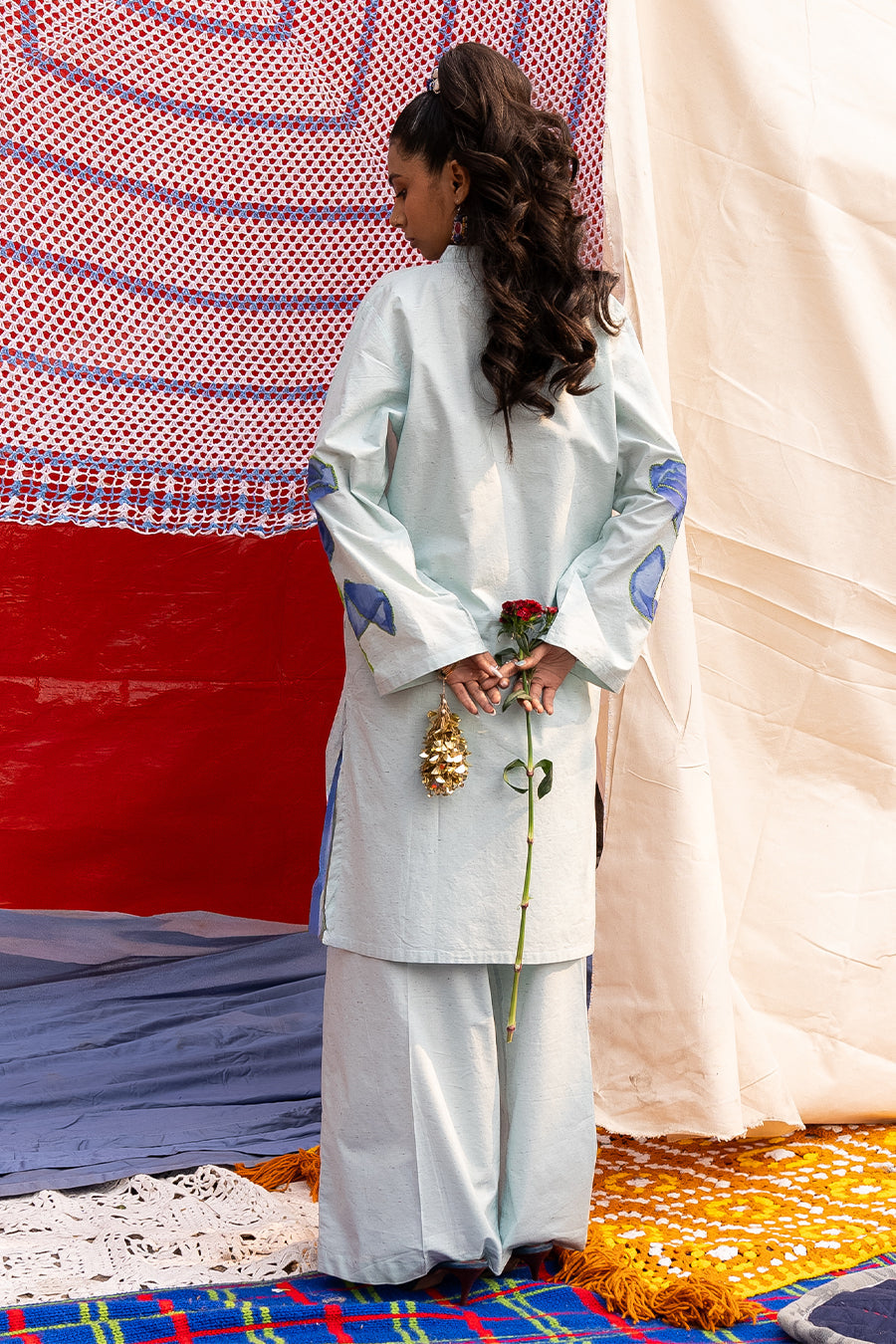 This loose-fit, hand-block printed shirt-trousers set is the perfect addition to your summer wardrobe. Featuring band collar shirt with overall block printed culottes.