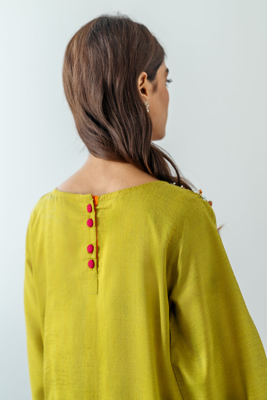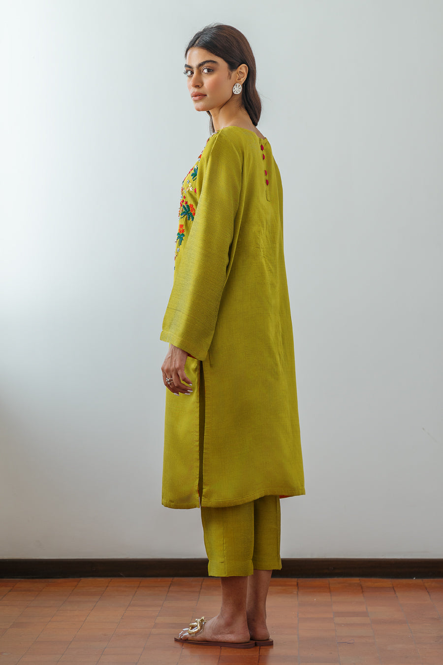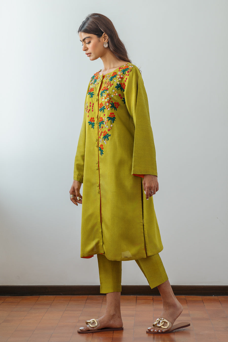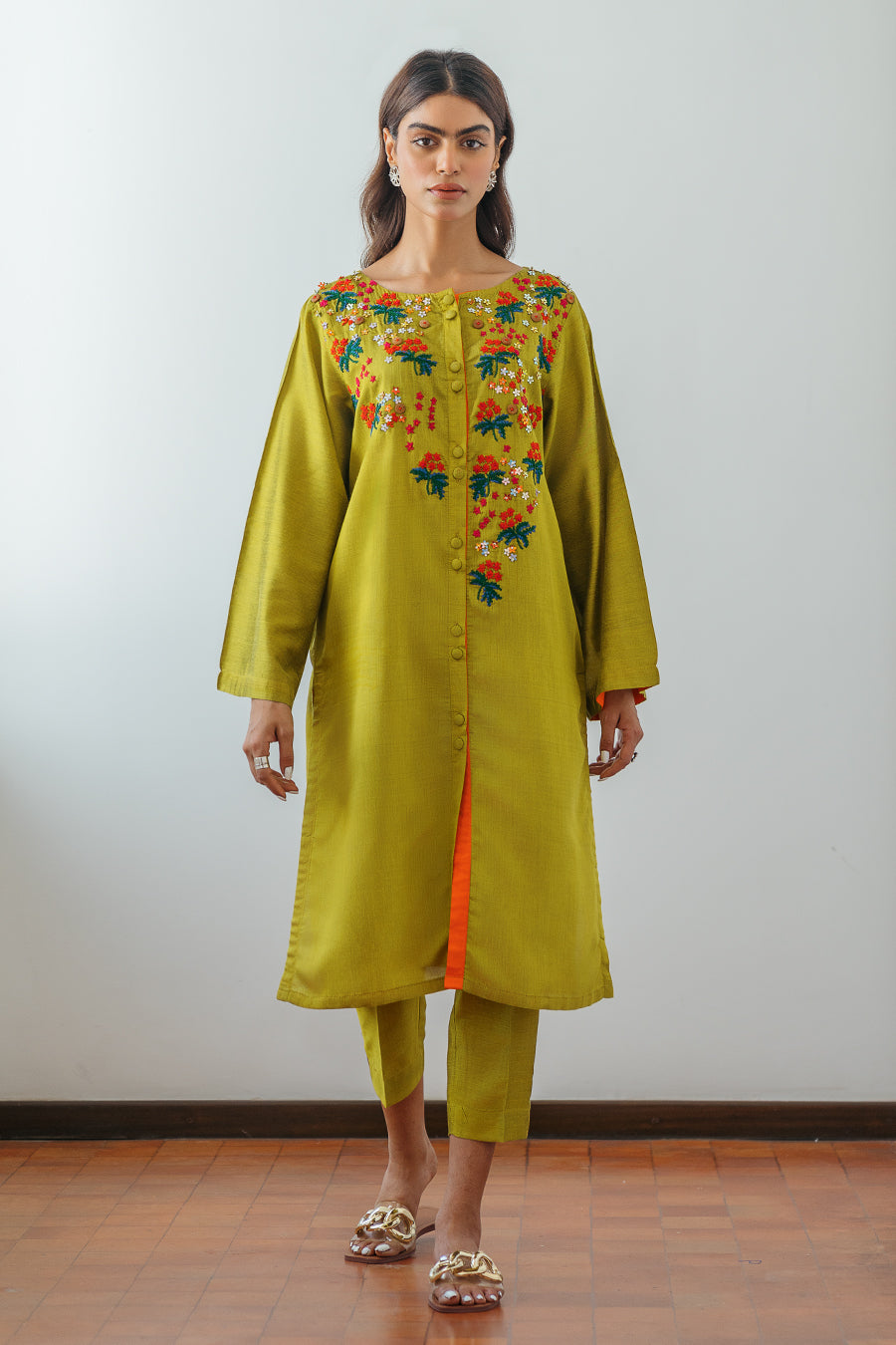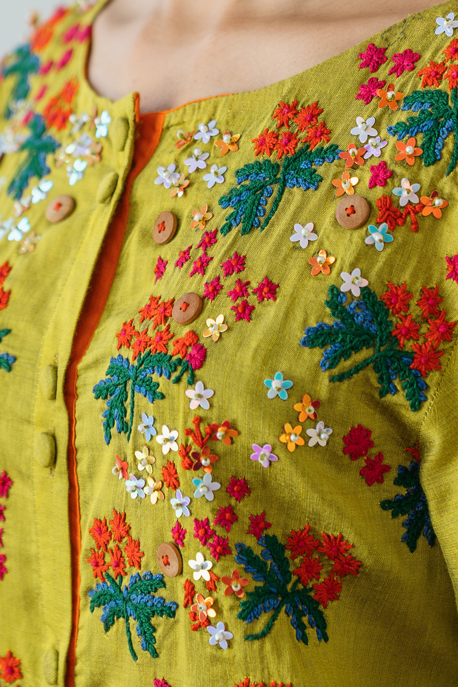 Front open shirt with hand embroidery in multi color thread and sequence. Button details at back neck. This is a 2 piece set. Matching pants are cropped straight fit.