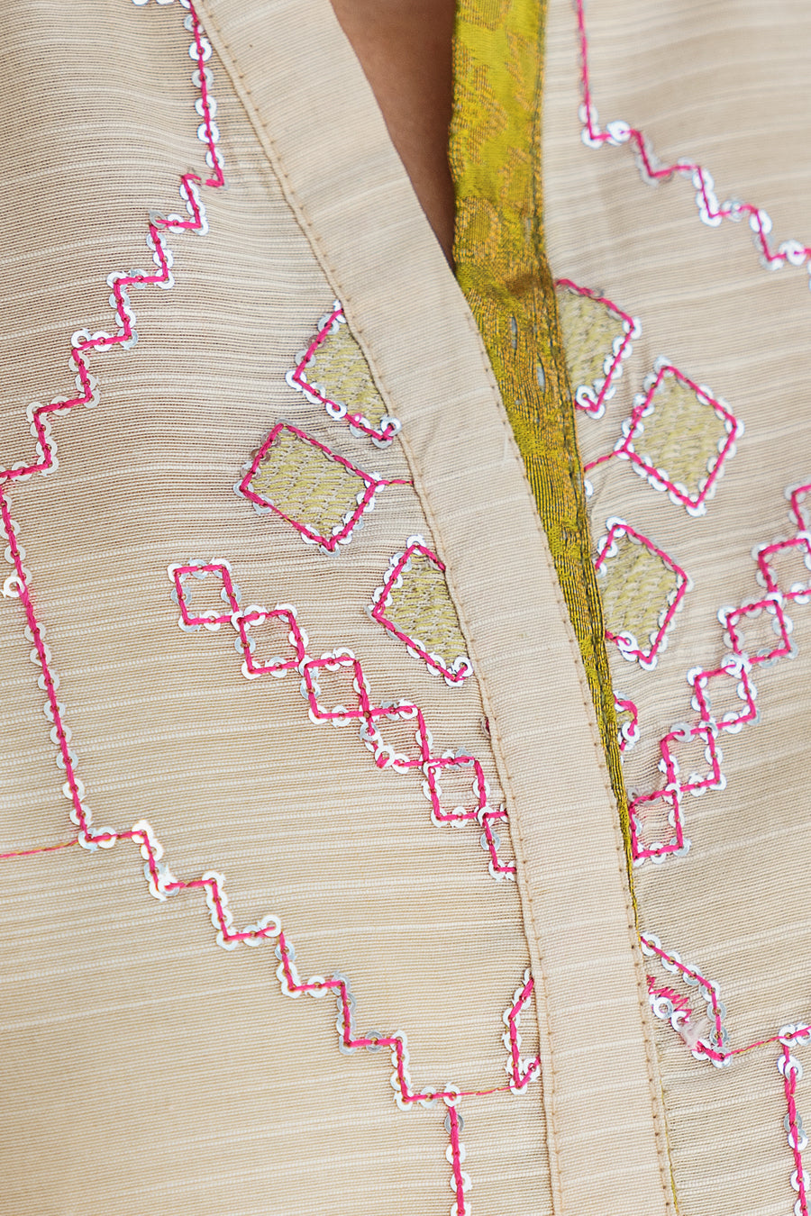 Over all sequence embroidery on shirt . Shirt comes with attached slip.