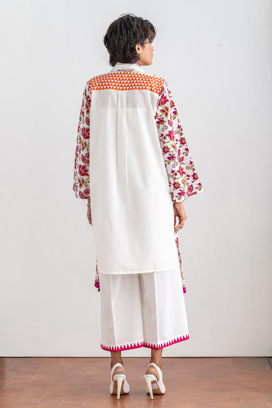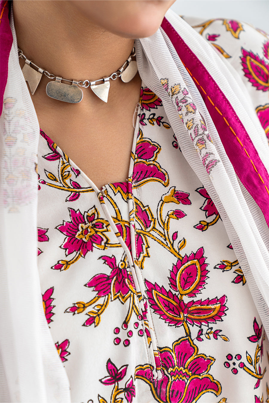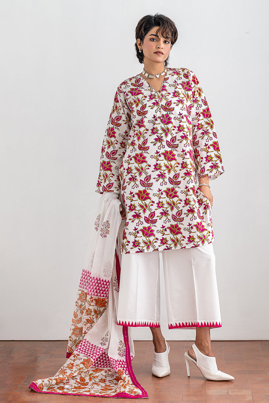 Three piece set. Block printed shirt with block printed dupatta. White pants with block printed border.