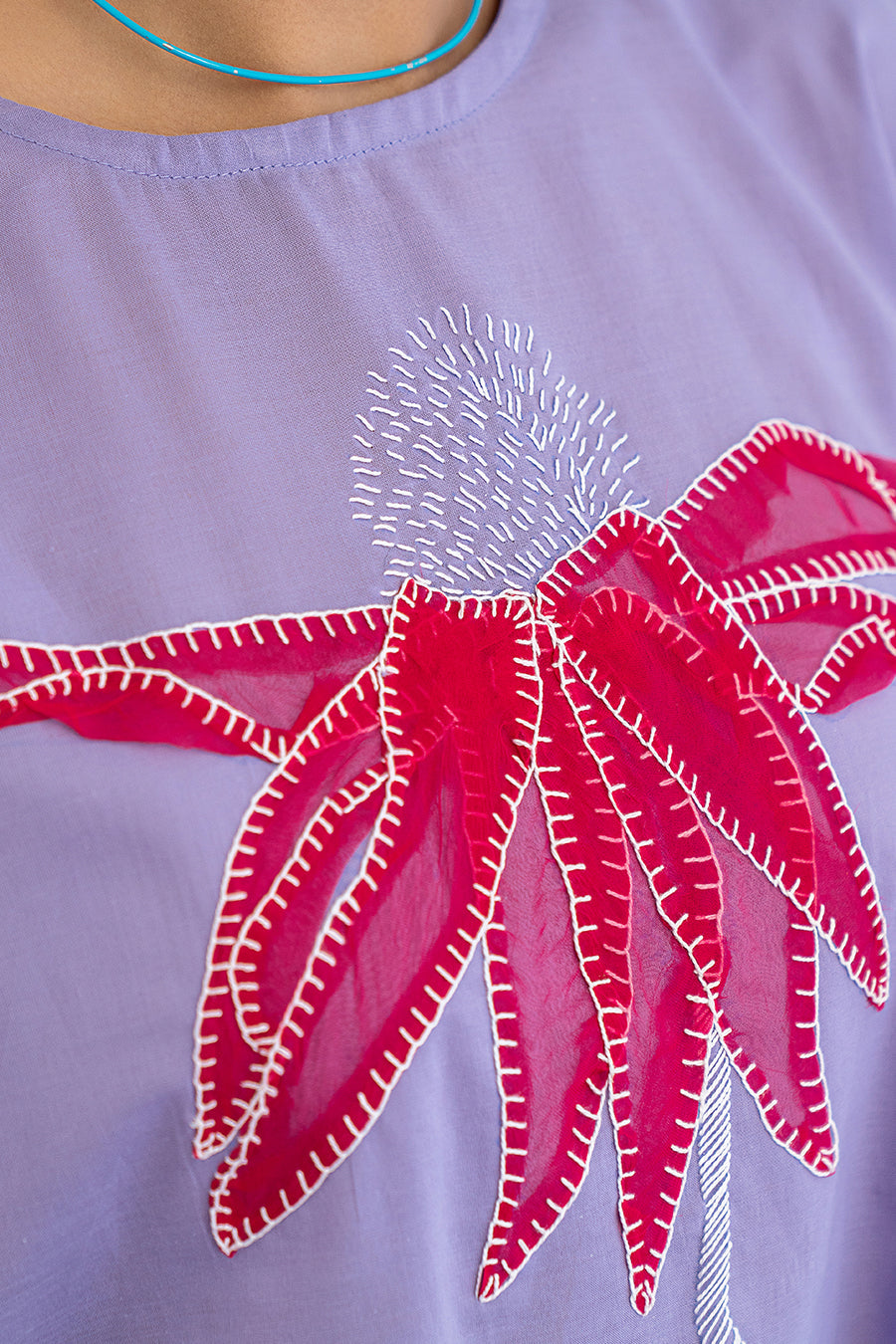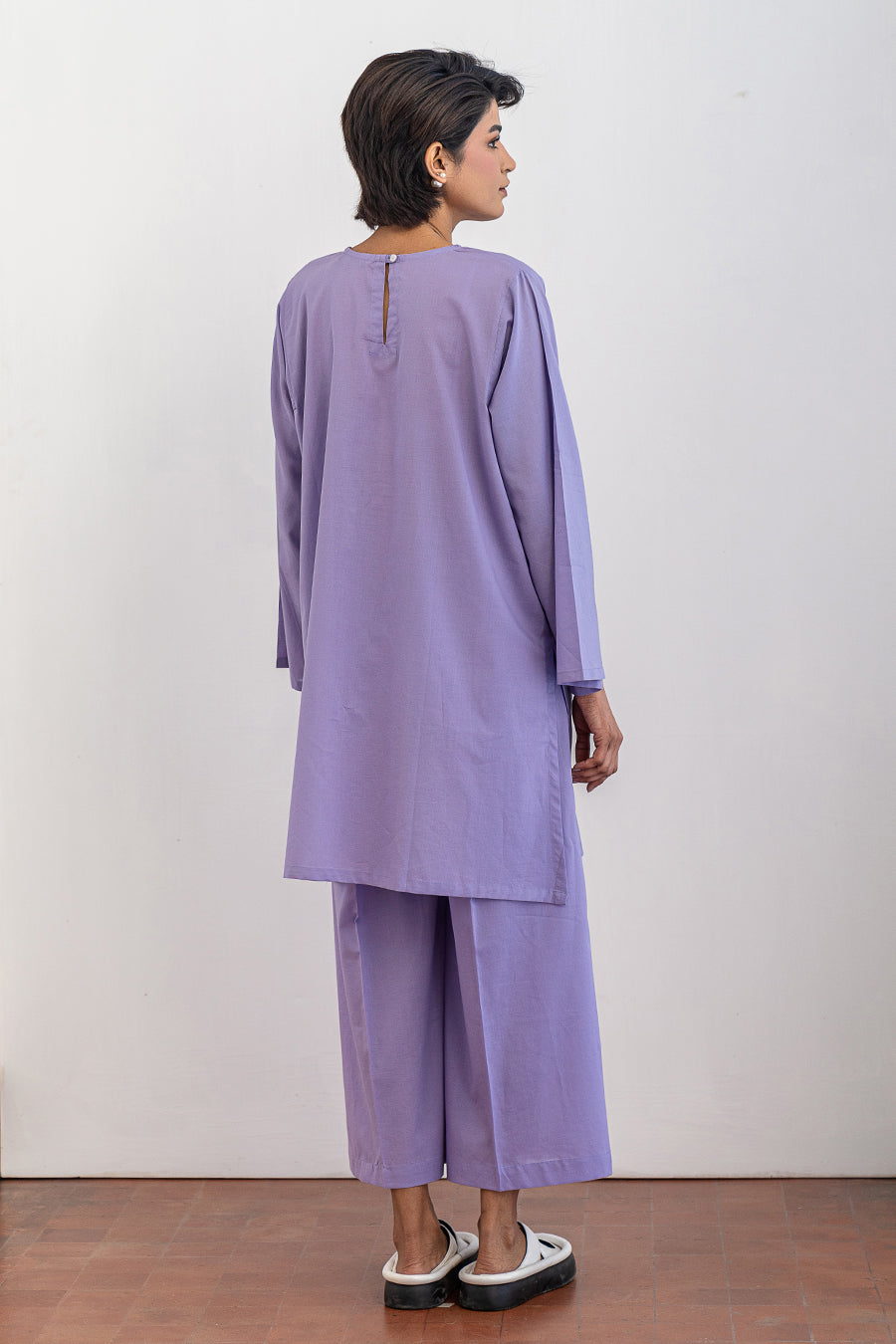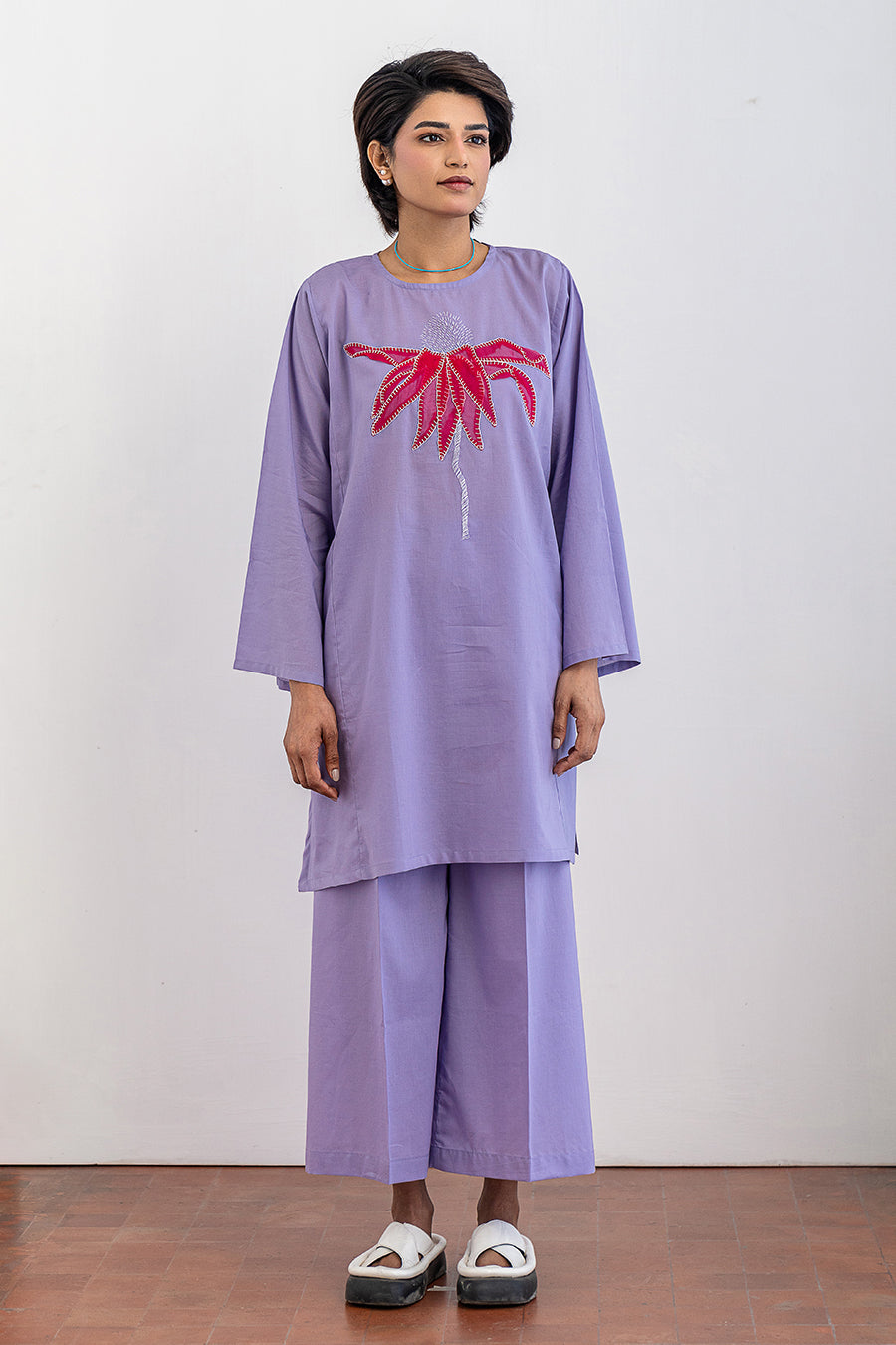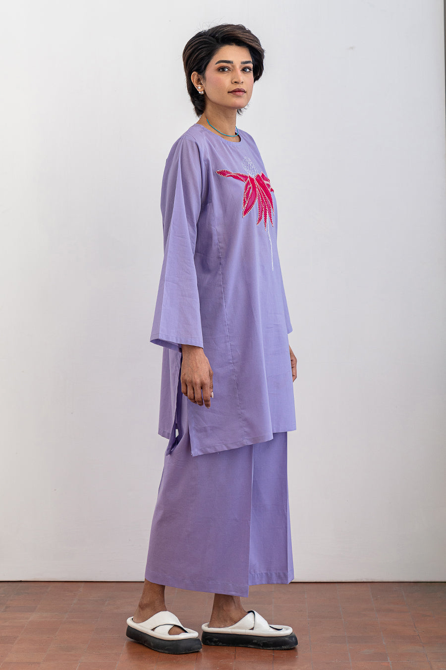 This loose-fit, hand-block printed shirt-trousers set is the perfect addition to your summer wardrobe. Featuring band collar shirt with overall block printed culottes.