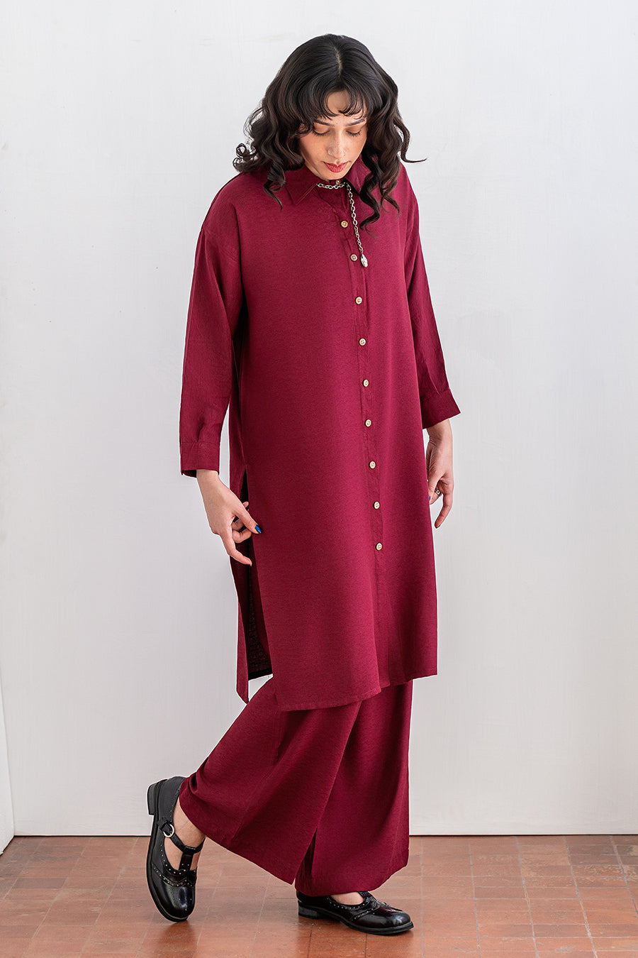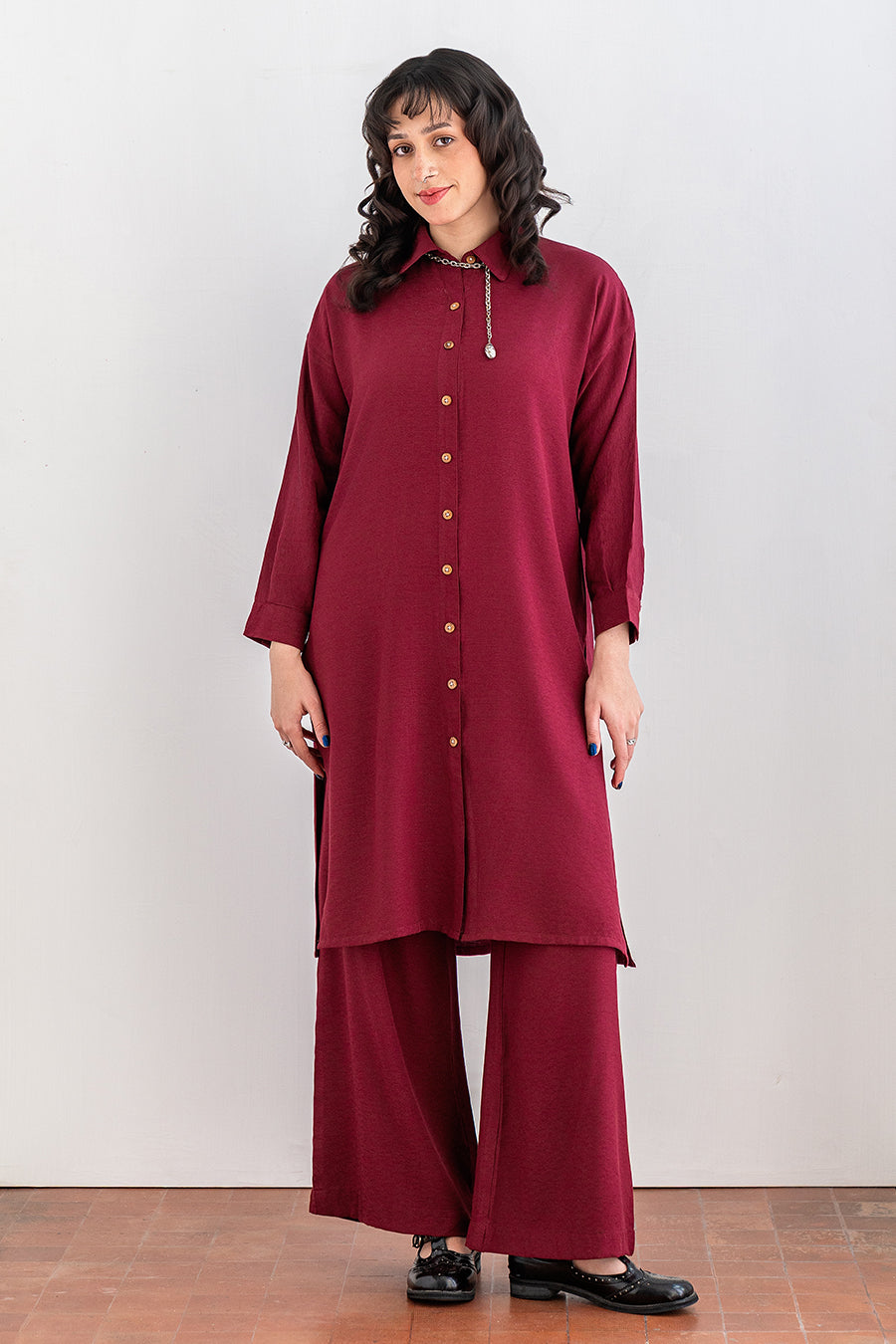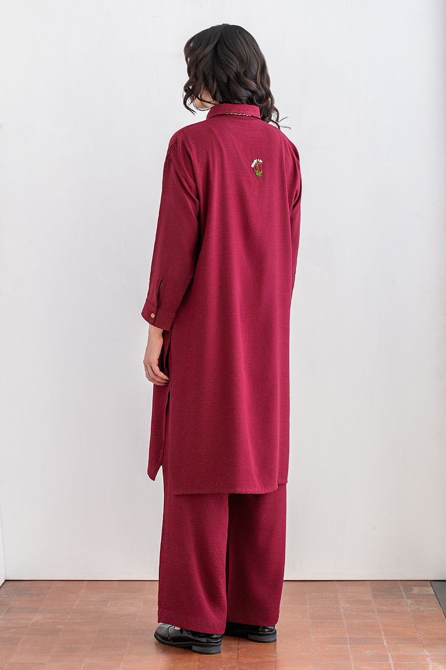 - Description: Collared Shirt With Handwork Detail With Slack Pants