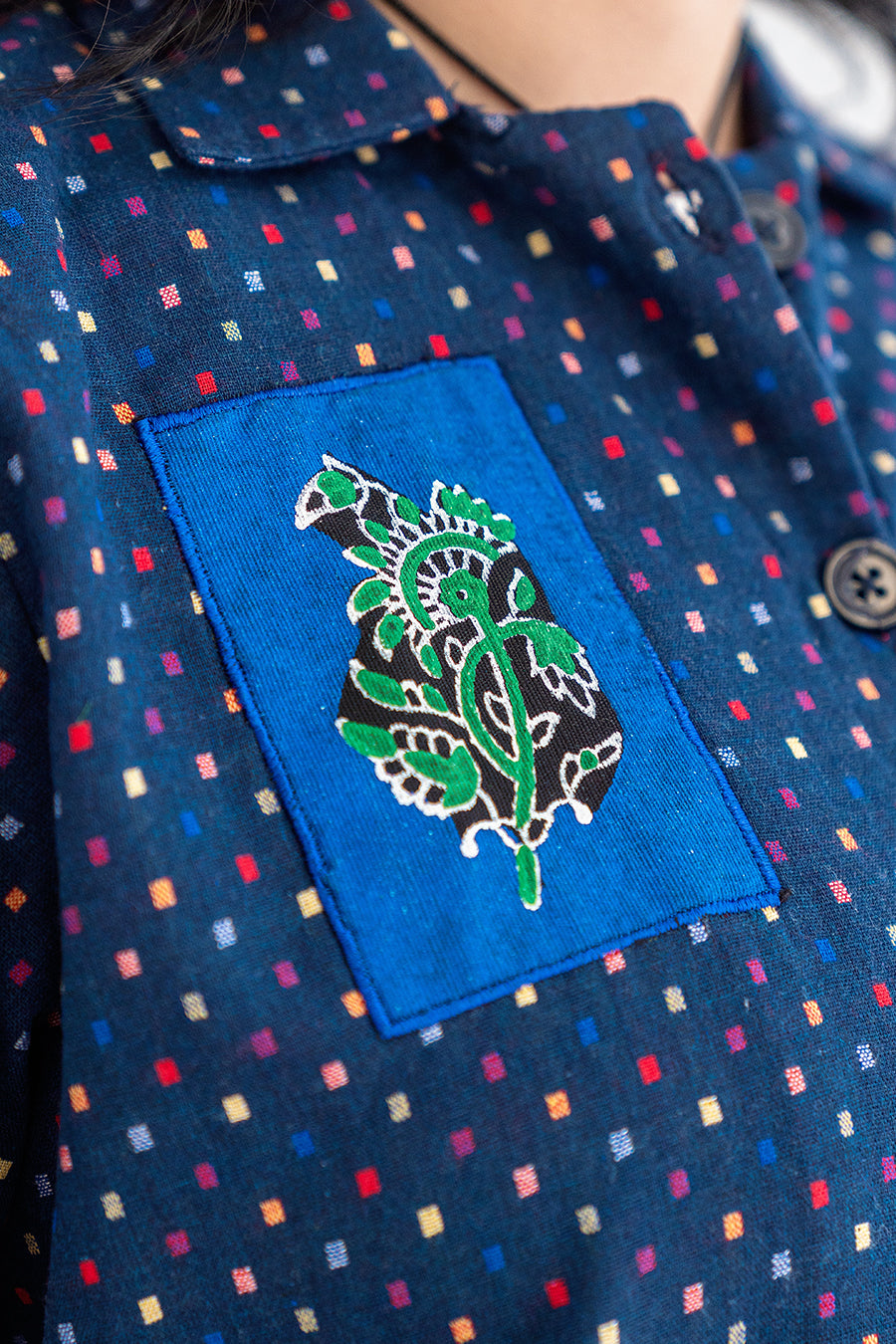 - Description: Button Down Shirt With Block Printed Patchwork And Barrel Cut Pants